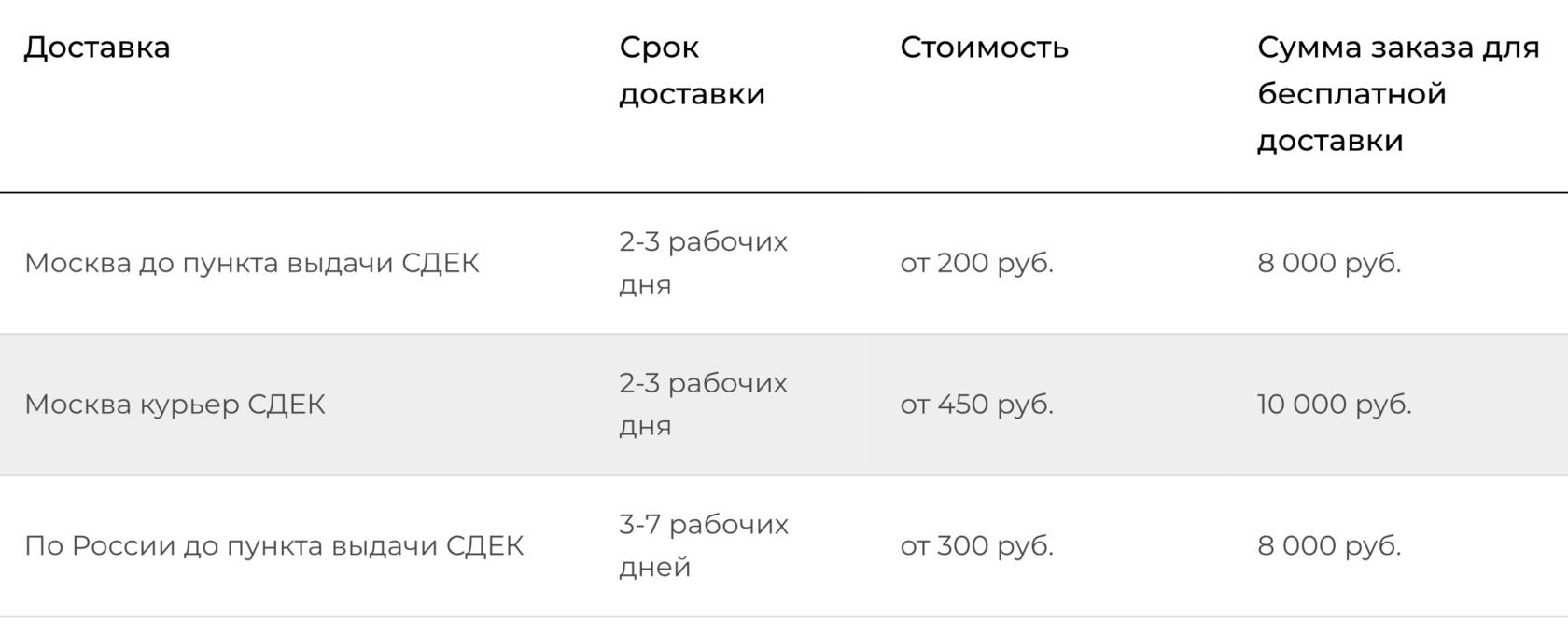 Варианты и стоимость доставки